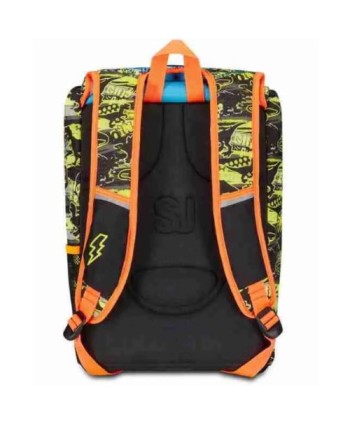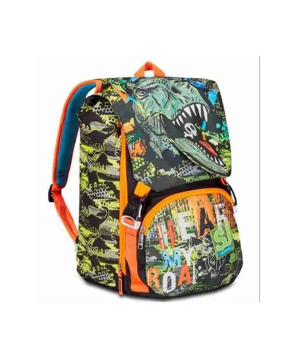 Lo zaino SJ Gang Rexme combina funzionalità e divertimento grazie al tema T‑Rex animato e al sistema estensibile che lo rende versatile nella scuola. Realizzato in poliestere resistente, passa da 22 L a 29 L espandendosi extra 6 cm con semplici zip laterali. Il design include una speciale “bocca” del dinosauro che si apre/chiude azionando un sistema ad aria su uno spallaccio. Lo schienale ErgoSystem termofomes e gli spallacci anatomici imbottiti e rivestiti in rete offrono comfort e postura bilanciata. Completano il set una tasca frontale, una tasca pattina, una tasca laterale porta borraccia, rifiniture rifrangenti e fondo rigido integrato.