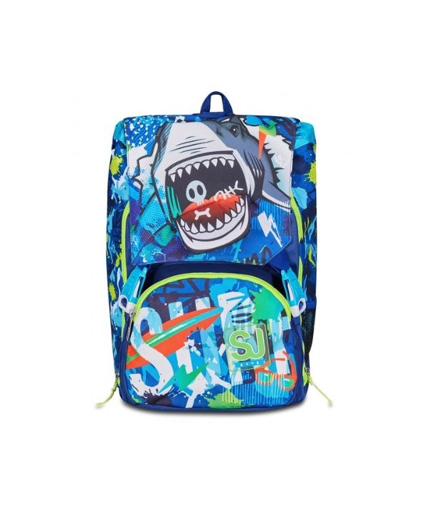 Lo zaino SJ Gang Shark Story porta un tocco di avventura marina a scuola con la vivace fantasia “squalo” e la bocca gommata 3D che si apre/chiude grazie a un sistema ad aria sullo spallaccio. Realizzato in poliestere resistente, è estensibile da 22 a 29 litri tramite zip laterali con un aumento di circa 6 cm di profondità. Lo schienale ergonomico ErgoSystem Termophomed con fondo rigido e gli spallacci imbottiti in rete traspirante offrono sostegno e comfort, mentre le tasche multiple (frontale, laterali per borraccia) e gli inserti rifrangenti garantiscono organizzazione e sicurezza.
