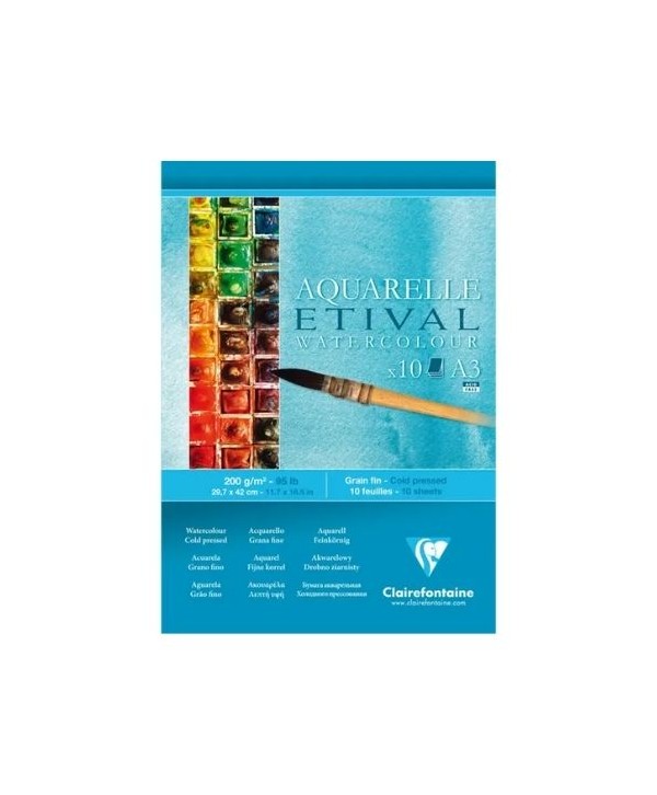 Marca: CLAIREFONTAINEBloc Carta Etival Grain Fin da 200 g/m², formato A3, 10 fogli incollati su un lato (encoll). Carta bianca da acquerello, adatta a studenti o tecniche leggere a base acqua.