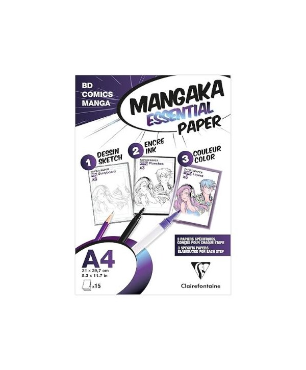 Marca: CLAIREFONTAINEKit Mangaka Essential formato A4 con 30 fogli assortiti (3 tipologie di carta), perfetto per coprire tutte le fasi del processo creativo manga: dallo schizzo all’inchiostrazione fino al colore.