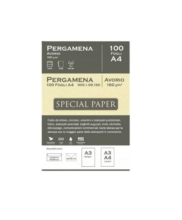 Marca: NO MARCARaccolta da 100 fogli di carta pergamena A4 avorio, grammatura 160 g/m², texture liscia, perfetta per partecipazioni, certificati, stampa a getto o laser.