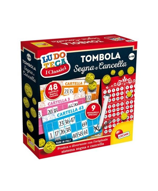 La Tombola Segna e Cancella edizione Ludoteca, firmata Lisciani, unisce il divertimento tradizionale della tombola con una versione pratica: le cartelle si segnano con pennarelli appositi e si cancellano con facilità, evitando sprechi. Include un set completo di 48 cartelle, numero esrazione, tabellone numerico, 90 pedine, sacchetto per i numeri, cancellino e 9 pennarelli cancellabili. Perfetta per bambini (dai 6 anni) e adulti, adatta a gruppi 2 o più giocatori.