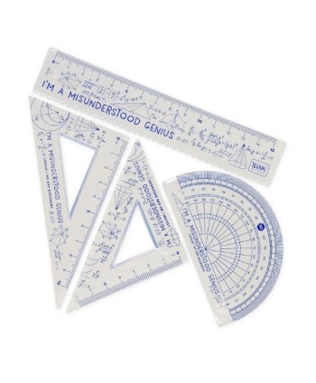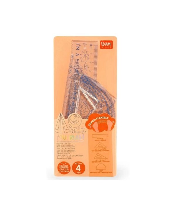Marca: LegamiSet geometrico completo con tema “Genius”, in plastica trasparente flessibile, che include righello, squadre, goniometro e custodia: perfetto per la scuola, per il disegno tecnico o per compiti di geometria.