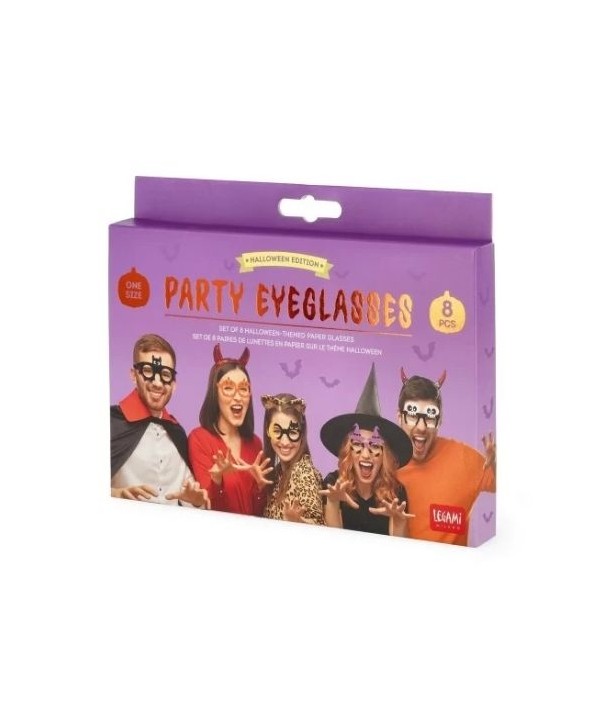 Marca: LegamiConfezione di 8 occhiali di carta con forme a tema Halloween (zucca, pipistrello, fantasma, teschio…), decorati con dettagli in glitter e foil, tutti in taglia unica, per rendere divertente ogni festa o travestimento.