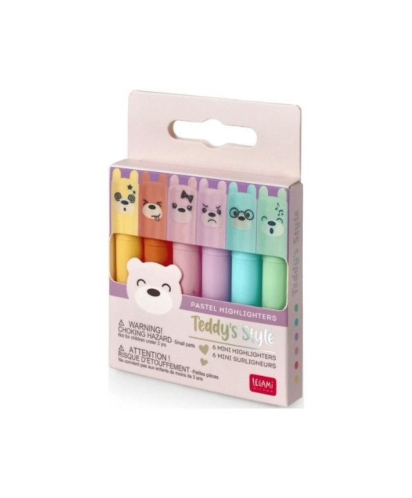 Marca: LegamiSet di 6 evidenziatori mini nei toni pastello, stile “Teddy’s Mood” di Legami, ideali per evidenziare testi con varietà di colore, perfetti per astuccio, studio o ufficio.