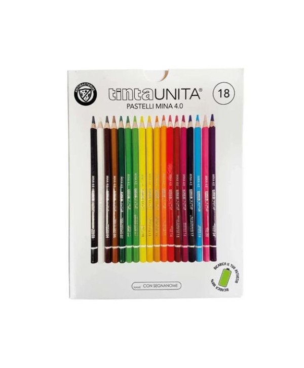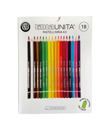 Marca: tintaUNITASet da 18 pastelli con mina da 4.0 mm, corpo in legno verniciato tinta unita, pensato per chi desidera una gamma cromatica più ampia con la qualità della linea Tinta Unita.