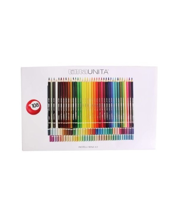 Marca: tintaUNITASet completo da 108 pastelli con mina 4,0 mm, disposto in cassettiera a più scomparti, ideale per artisti e scuole che necessitano di ampia varietà cromatica.