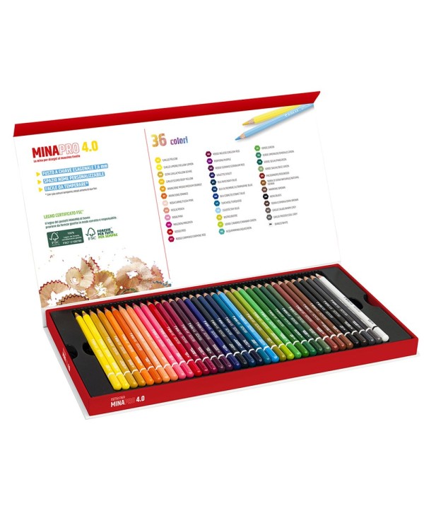 Marca: SevenSet da 36 pastelli “MinaPro 4.0” colori classici in astuccio rigido. Fusto 7,6 mm, mina spessa, legno FSC, spazio nome personalizzabile.