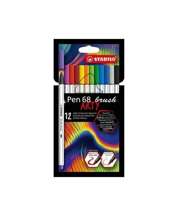 Marca: StabiloSet da 12 pennarelli STABILO Pen 68 Brush Arty Line con punta a pennello flessibile. Inchiostro a base d’acqua miscelabile, colori brillanti, ideali per brush lettering, effetti acquarello e disegno creativo.
