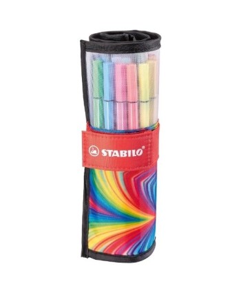 Marca: StabiloRotolo Arty Stabilo Pen 68 con 25 pennarelli felt-tip dal tratto spesso (1 mm), dai colori saturi e vibranti, in comodo rotolo con finestra e chiusura in velcro.