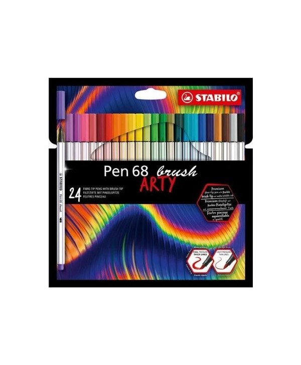 Marca: StabiloSet completo STABILO Pen 68 Brush ARTY con punta brush flessibile che consente tratti sottili o spessi variando la pressione. Inchiostro water-based per effetti acquerello.