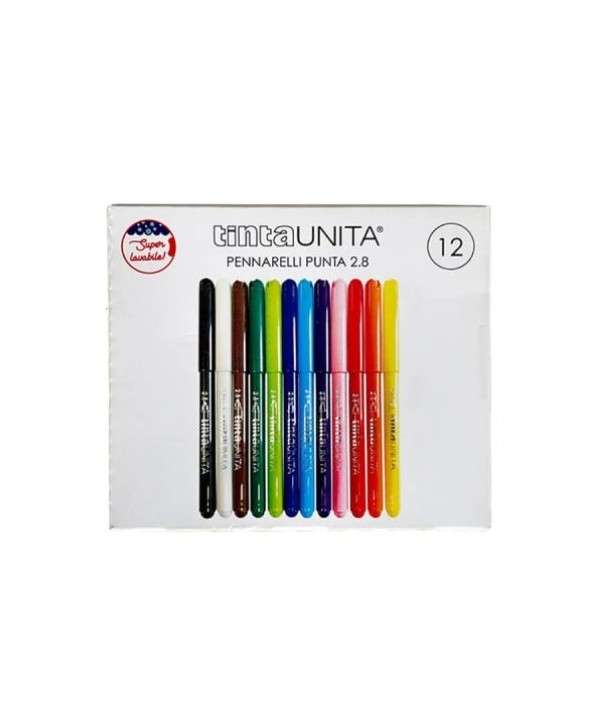 Marca: tintaUNITASet da 12 pennarelli con punta 2,8 mm, inchiostro lavabile e sicuro, punta resistente anti-rientro, cappuccio ventilato e tappo sicurezza, ideale per astucci compatti e disegni di dettaglio.
