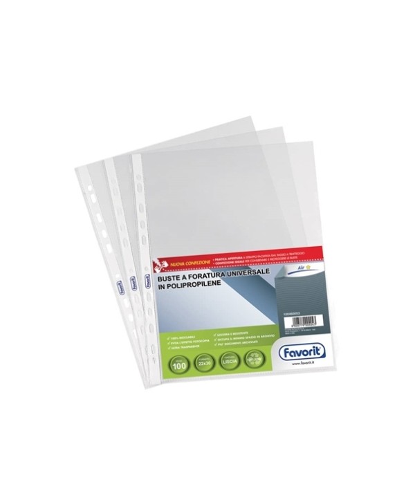 Marca: FAVORIT SPAConfezione da 100 buste in polipropilene Naturene®, trasparente con foratura universale, formato utile 22×30 cm, spessore basso, per un’archiviazione leggera ed efficiente.