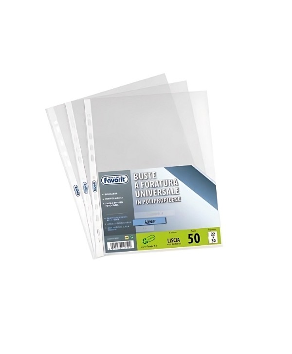 Marca: FAVORITConfezione da 50 buste a foratura universale modello Linear di Favorit, in PP liscio, formato 22×30 cm, perfette per proteggere documenti con qualità “super clear” e finitura trasparente liscia.