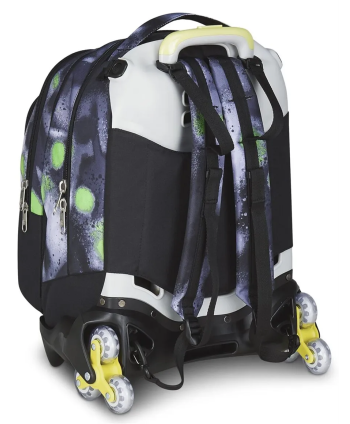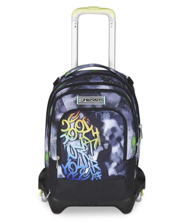 Il Trolley Seven Jack 3 WD+ Detach Sprint Paint Boy da 37 litri unisce versatilità e comfort: ruote triple consentono di superare scalini senza sollevarlo e la doppia maniglia telescopica offre una presa stabile. Il carrello è staccabile, trasformando lo zaino in autonomia completa. Realizzato in poliestere robusto, ha spallacci imbottiti a scomparsa (sistema Cross‑Over), schienale ergonomico e tasca frontale organizer con porta penne. Il fondo rigido anti‑urto con protezioni angolari garantisce resistenza, ideale per la scuola o i viaggi.