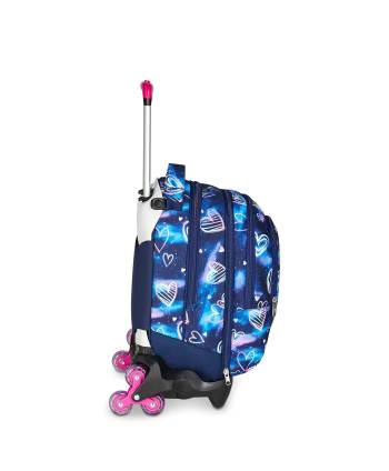 Il Seven Jack 3 WD Detach Gloomy Heart da 37 litri è un trolley scolastico 3‑in‑1 progettato per tre modalità d’uso: trolley, zaino con carrello agganciato o zaino indipendente. Le ruote triple per lato facilitano il passaggio su scale e scalini, mentre la maniglia telescopica a doppia asta garantisce maneggevolezza stabile. Lo schienale imbottito e gli spallacci ergonomici a scomparsa (Cross‑Over System) offrono comfort anche in modalità zaino. Il doppio scomparto capiente, la tasca organizer frontale staccabile, il vano portaborraccia interno e il fondo rigido con protezioni angolari assicurano resistenza e organizzazione perfetta per libri, astucci e snack. Il design “Gloomy Heart” unisce stile e funzionalità